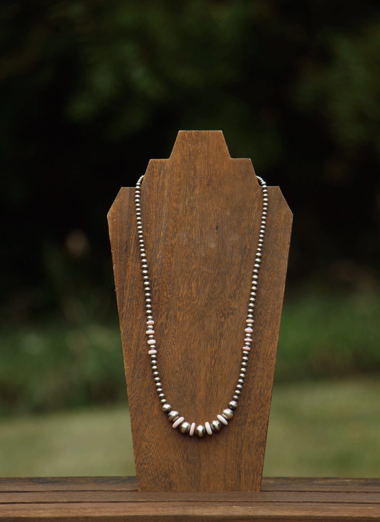 This necklace is 20” long with a 2” extender! Features pink conch beads with 12-3mm startling pearls.