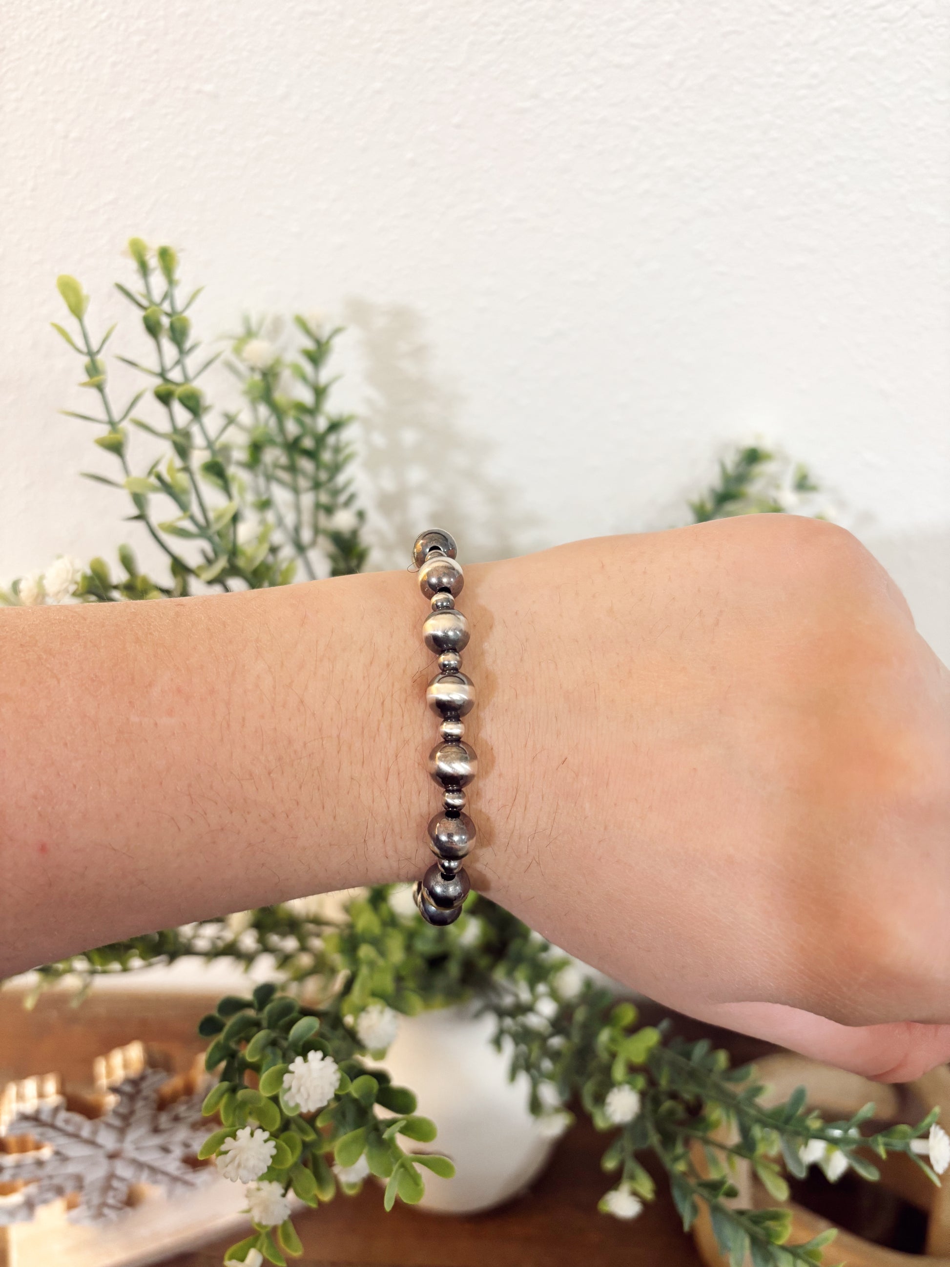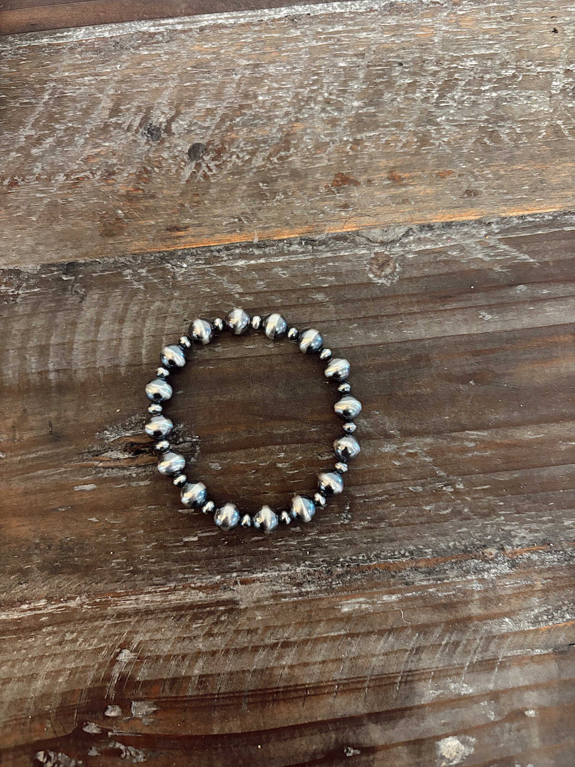 A timeless staple designed for everyday wear. This bracelet features a classic mix of 4mm and 8mm Navajo pearls, creating the perfect balance of subtle detail and bold western style. Strung on a comfortable stretch cord, it slips on easily and layers effortlessly with your favorite stacks or stands beautifully on its own!!